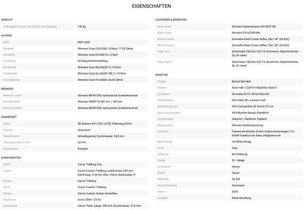 - Beleuchtung & Anbauteile: Das Carver Route 140 20s ist mit einer AXA Compactline 35 Switch 30 Lux Scheinwerfer vorne und einer AXA Blueline Steady mit Standlicht hinten ausgestattet, was dir optimale Sichtbarkeit bei Dunkelheit sichert. Zudem sorgen die integrierten Schutzbleche und der Gepäckträger (Racktime Topdeck) dafür, dass das Modell nicht nur straßentauglich ist, sondern auch ideal fürs Pendeln und längere Touren geeignet ist.