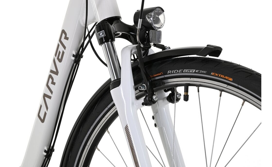 • Rahmen & Gabel: Der Aluminiumrahmen des Carver Tour 100 kombiniert Leichtigkeit mit Stabilität. Die Gabel vom Hersteller Suntour mit einem Federweg von 50 mm sorgt für ein angenehmes Fahrgefühl auf unebenen Strecken und unterstützt die Vielseitigkeit des Rades im Freizeit- und Sportbereich.